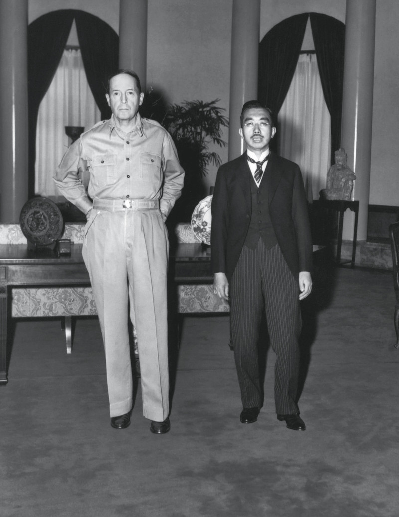 天皇裕仁和麦克阿瑟的合影照片,刊登在1945年9月29日所有的日本报纸上。在这张由美国摄影师拍摄的照片上,裕仁戴着眼镜,穿着正式的西装,昂首立正,而与他并排而立的麦克阿瑟穿着宽松的军服,双手叉腰,很随意地站在一旁。高大魁梧的麦克阿瑟映衬得裕仁愈发瘦小,而两人的肢体语言让人觉得实力超凡的占领军对天皇是追究责任还是保护都易如反掌,全看天皇的表现。