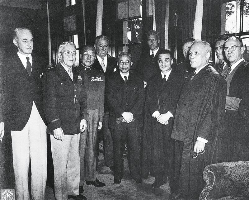 1947年,日本东京,中国外交部长王世杰与远东国际军事法庭法官合影。前排左三为驻日军事代表团团长商震、左四为王世杰、左五为大法官梅汝璈