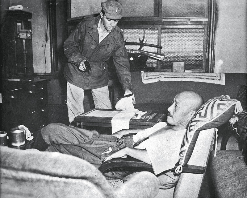有吉普车停在门口,下来几个宪兵,敲开了东条家的大门,刚进到室内,就听见像鞭子一样的枪声。东条英机倒在了面向窗户的椅子里。
