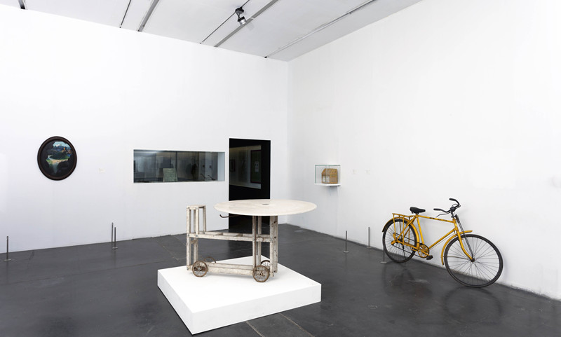 ( 尤伦斯当代艺术中心现场,中国艺术家和杜尚的“对话”展部分。图为两件装置作品:黄永砯的《四个轮子的大转盘》(1987)和王鲁炎的《W自行车》(1992) )