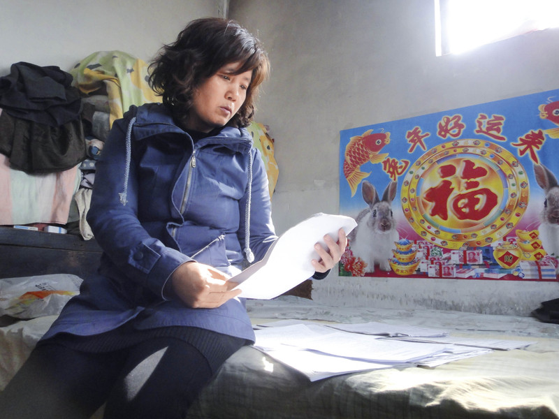 ( 4 月16 日,赵艳锦在河北安新家中。心中装满冤屈的她不时地翻看判决书 )