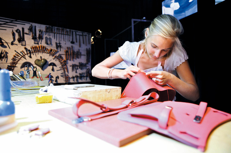 旋转木马般的展览装置、腾跃在空中的鱼子酱和伏特加酒盒、30年代巴黎橱窗中摇摆的裙裾、被“手形森林”托起的领带匣、摆放在镜前如孔雀开屏的凯莉包与柏金包……集市、乐园或森林,策展人奥利维·塞拉德(Olivier Saillard)描述这场在上海淮海路228号拉开序幕的爱马仕“缝制时间”皮具展,是一种“林中漫步”般的乐趣:“我想大家可以用一种在林荫大道上散步的方式来感受这次展览。”