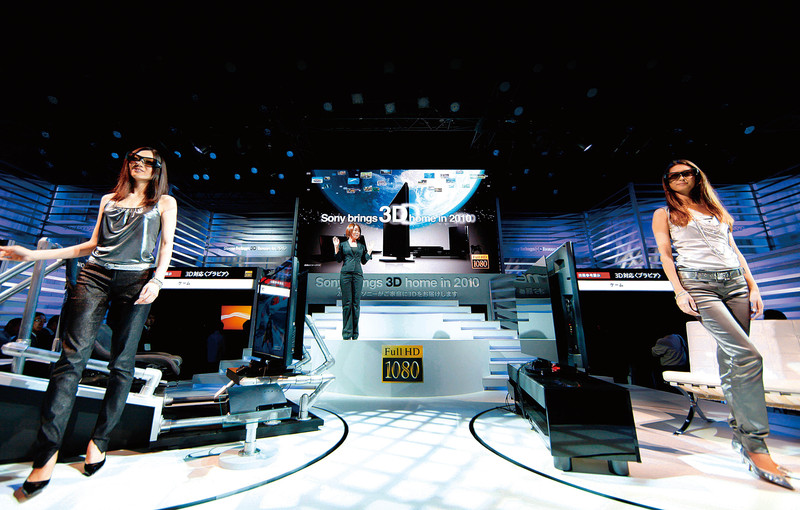 ( 2009年10月7日,在日本东京附近千叶举行的日本电子高新科技博览会上,一名模特展示索尼公司的3D电视系统 )