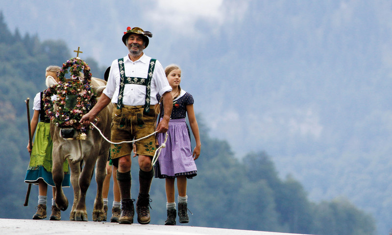 9月10日,德国上施陶芬,穿着传统服装的巴伐利亚牧民放牧归来。夏季放牧季节结束,牧人们赶着约1200头牛浩浩荡荡回家 )