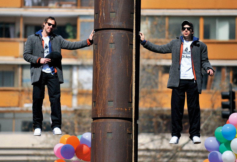 9月9日,智利两名双胞胎魔术师在一个高大的纪念碑前进行悬空魔术表演,他们两人在7米高的空中悬空了200分钟,以此庆祝即将到来的智利建国200周年纪念日。有业内人士透露,兄弟俩撑着柱子的那只手是假手,外观看起来与人手没什么两样,里面却藏着连接到柱子上的金属棍,金属棍的另一端有个支架,可以支撑住住身体和腿的重量,而兄弟二人的真手藏在外套里。 )