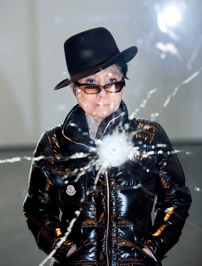 列侬遗孀小野洋子(下图)在柏林举行作品展。雕塑作品《弹孔》是展览上的一个焦点,作品展示了子弹穿透玻璃后的景象,玻璃上刻着“到玻璃的另一侧透过洞来看”,鼓励参观者透过侵害者和受害者的两种角度来看待问题。 )