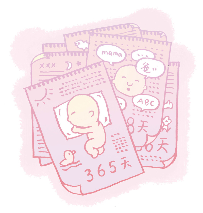 在第一天知道你已成长在我身体之中时,我就想好了,要用纸和笔为你尽可能地记录,而这些随着时间的流逝将会变黄变脆的纸张,这些妈妈深深浅浅或黑或蓝的字迹和漫画,直到你16岁生日时,我会全部交给你,从此,你生命之初的这些痕迹,将由已迈入成人行列的你自己保管。16岁应该成人了,应该是一个人开始形成初步的人生观、价值观的时候,到那个时候,爸爸会告诉你他为什么会给你取那三个字的大多数人只认得第一个字的大名。而我相信,这些最原始的纸质的记录,最朴素的厚厚薄薄、大大小小的本儿,卷了边,磨了线,有些字迹已被水迹或奶渍濡湿模糊,却正是厚重的光阴用缓慢而又疾速的脚步留给未来的你的最好的礼物。
