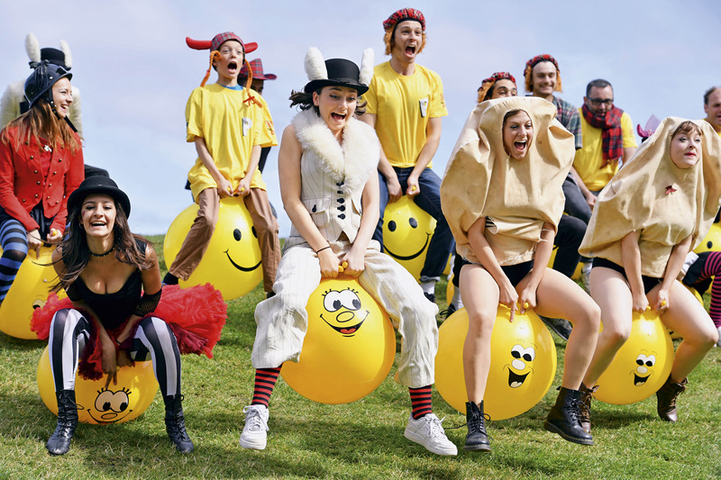 8月15日,英国苏格兰爱丁堡卡尔顿山,Pleasance剧团的演员骑着健身球参加活动。这是Pleasance剧团和威弗利保健中心(Waverley Care)合作举办的活动,旨在提高人们对艾滋病的防范意识,并为艾滋病人筹款。