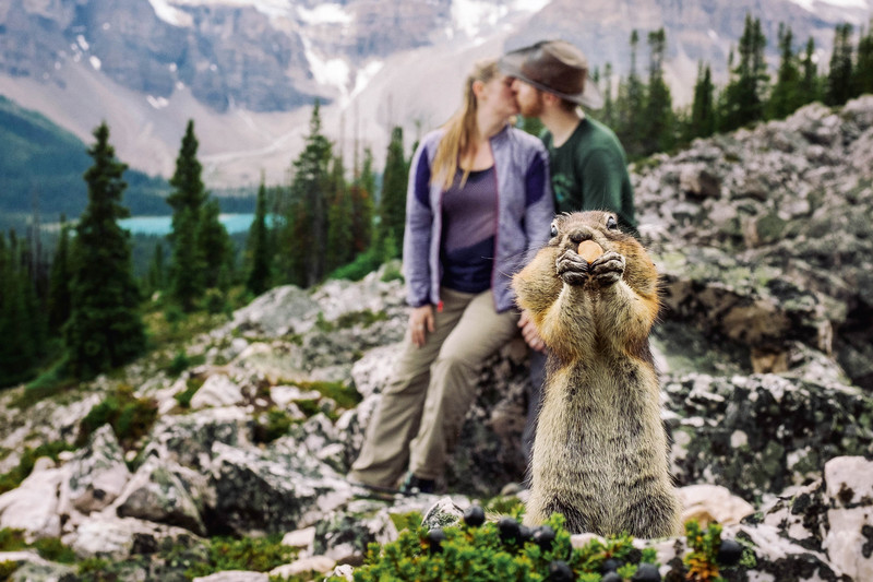 一对情侣在加拿大班夫国家公园拍摄订婚照时,一只松鼠意外闯入镜头,成为婚照的一大亮点。这只松鼠用双爪捧着自己的食物,津津有味地咀嚼着,十分可爱。