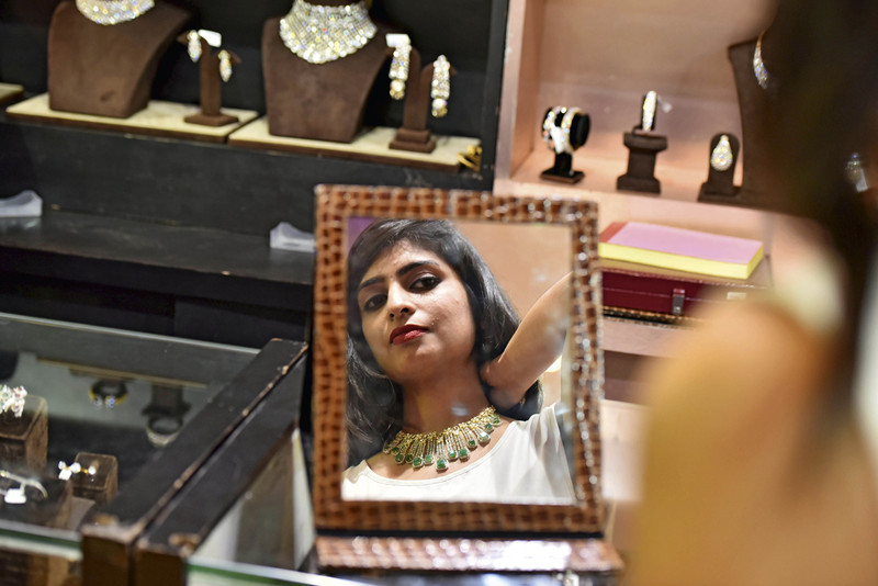 8月19日,“Glamour 2016珠宝展”在孟买撒哈拉星辰酒店(Hotel Sahara Star)举行。Glamour珠宝展是印度最负盛名的展览之一,会上展示的珠宝均代表时下珠宝流行趋势。图为一名女士在展览上试戴项链。 )