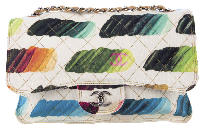 香奈儿Colorama水彩帆布包在菱格帆布表面印制多彩的图案,黄麻与银色金属交织成背带链条,前盖的银色Logo中融入了旋转锁。