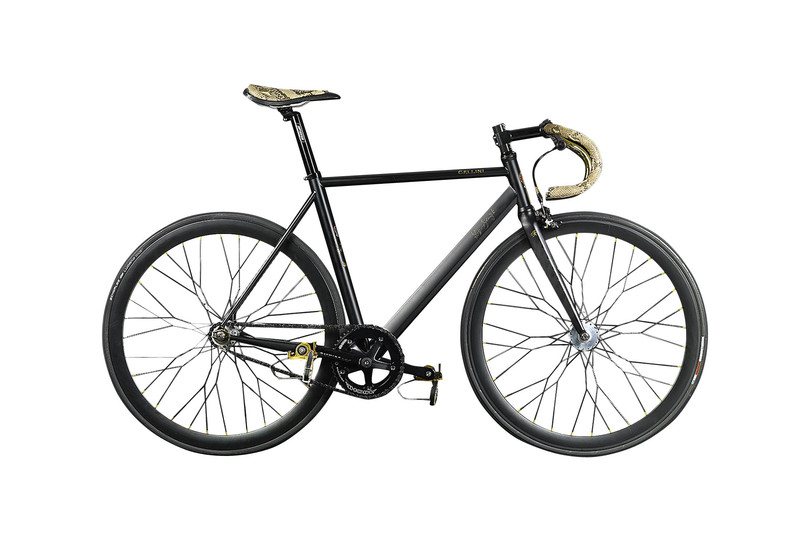 这款名为 “Cellini Uomo”的自行车,车把表面镀了一层24K黄金,其余的地方和座椅都覆盖了金色的人造蛇皮装饰。自行车两侧的脚踏板都使用阳极氧化金工艺制造,轴承采用钛合金材质。制动杆则采用传统摇杆式,通过控制前轮制动。