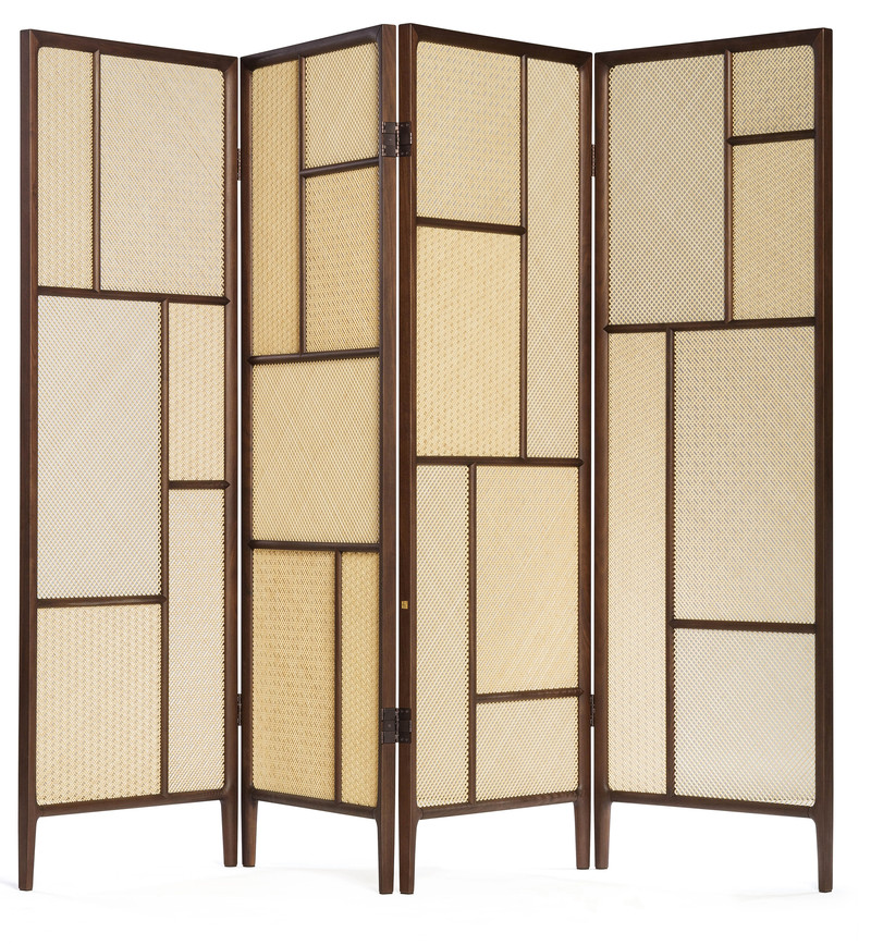 “上下”推出的四曲叠扇屏风以黑胡桃木制成。“上下”二字变成长短线,将单屏分隔成大小框格,内部嵌入的三种不同厚度、密度和纹理的竹丝镶嵌花板,在光线的折射下呈现出深浅不一的颜色。