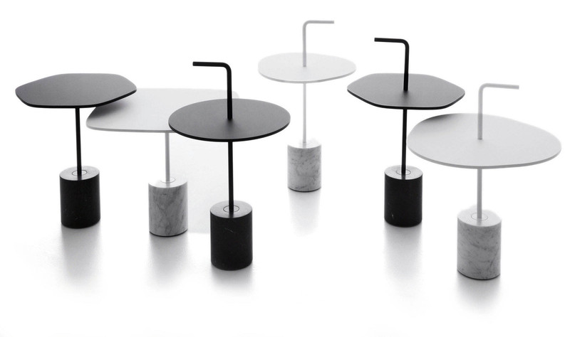 弗朗切斯科·罗塔为Lapalma设计的Jey边桌,圆柱形大理石或混凝土底座搭配圆形、正方形、六边形等不同形状的层压板桌面,手柄状的弯曲管便于搬动桌子。