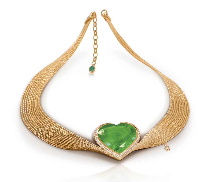 德国华洛芙珠宝“嫣然心韵”项链,金丝编花链中心镶嵌一颗心形切割的46克拉祖母绿,这颗色彩饱满的宝石产自哥伦比亚莫索矿区。 )