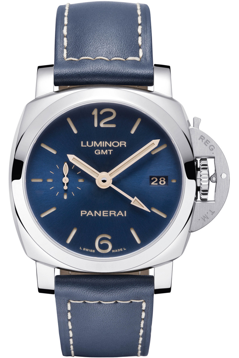 沛纳海新款Luminor 1950三日动力储存自动腕表,搭载P.9001自动上链机械机芯,湛蓝色表盘装饰缎面太阳放射饰纹,如同阳光映照下海面波光粼粼的景象。