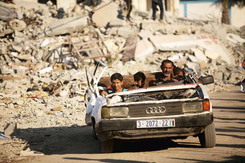10月14日,加沙北部拜特汉诺镇的居民开着被毁车辆。当天,联合国秘书长潘基文访问了加沙地带和以色列南部。潘基文称,加沙遭到的破坏比2009年冲突期间更为严重。他告诫以色列和巴勒斯坦官员,不解决冲突根源,加沙就没有实现长期稳定的希望。