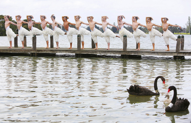 10月15日,舞剧“天鹅湖”的男演员在墨尔本艾伯特湖公园里大秀舞姿。