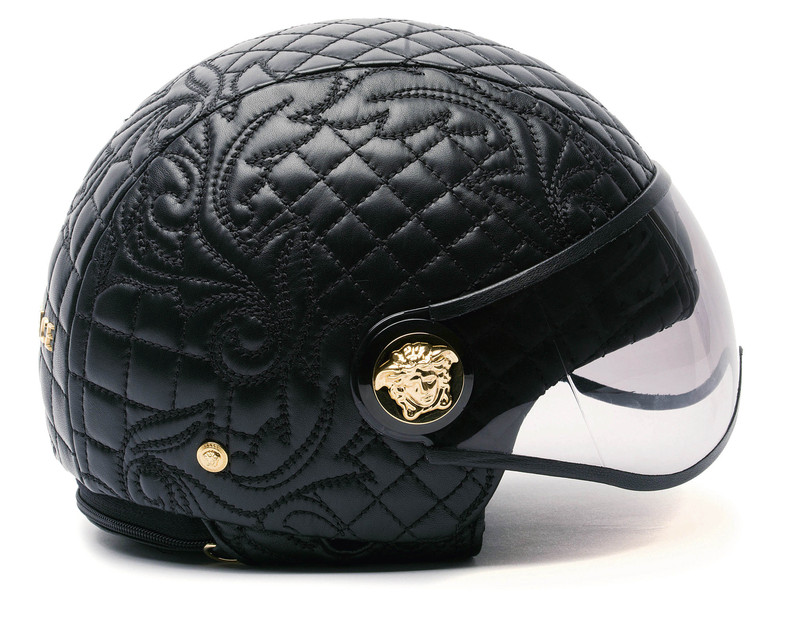 2014Versace秋冬季男装主题为年轻、自由、自主、性感、无惧的电单车骑士,这款玻璃纤维质头盔表面包覆印花缝线皮革,风挡面罩玻璃与头盔连接处旋钮表面饰有金色Versace品牌Logo。