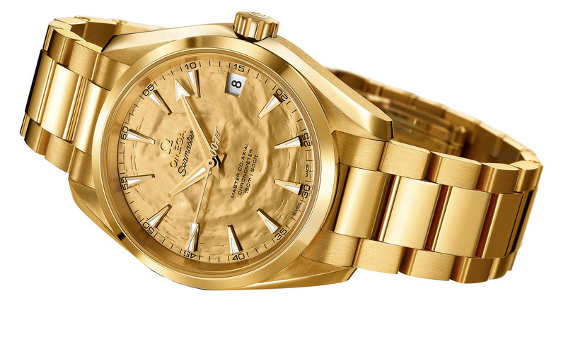 欧米茄Aqua Terra腕表是向电影《007金手指》50周年致敬之作,38.5毫米表壳、表链、表盘及指针都是用18K黄金打造,中央秒针尾端是精致的“007”标志。腕表搭载欧米茄8501同轴机芯,透明底盖的黄金表底圈上镌刻“Goldfinger”(金手指)、“50th Anniversary”(50周年)等字样。