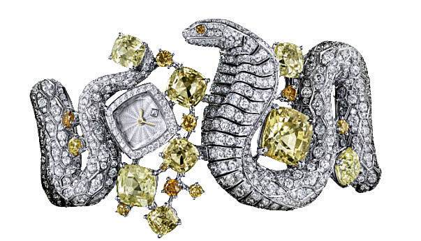 18K镀铑白K金表壳及表链,1枚钻石时标,9颗枕形切割黄色蓝宝石,总重24.28克拉,1351颗明亮式切割圆钻,总重16.08克拉,7颗明亮式切割橙色圆钻,总重0.88克拉,5颗明亮式切割黄色圆钻,总重0.51克拉,总设计制作时间达到1600小时以上。