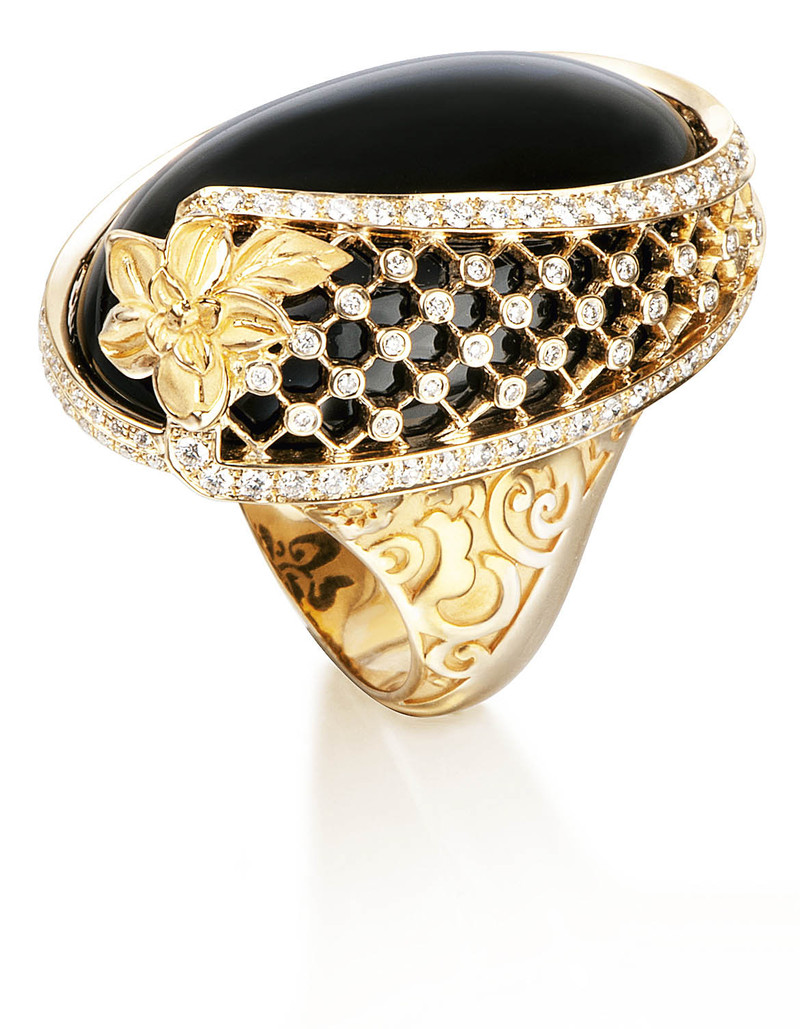 西班牙卡瑞拉·卡瑞拉珠宝的“塞尔佩”(Sierpes)系列,交叉格纹设计是模仿马尼拉披肩的网格,并以花朵为点缀。耳环垂下的链索摇曳生姿,如同披肩流苏的形态。