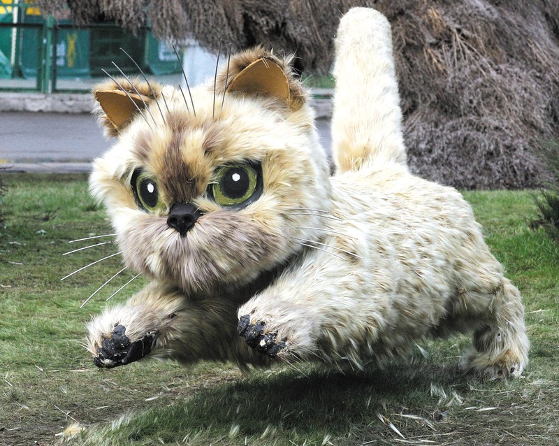 2007年1月19日,俄罗斯莫斯科动物园内展出由稻草制成的各种动物雕塑吸引游客,有熊猫、大猩猩等。图为一只小猫的稻草雕塑。■