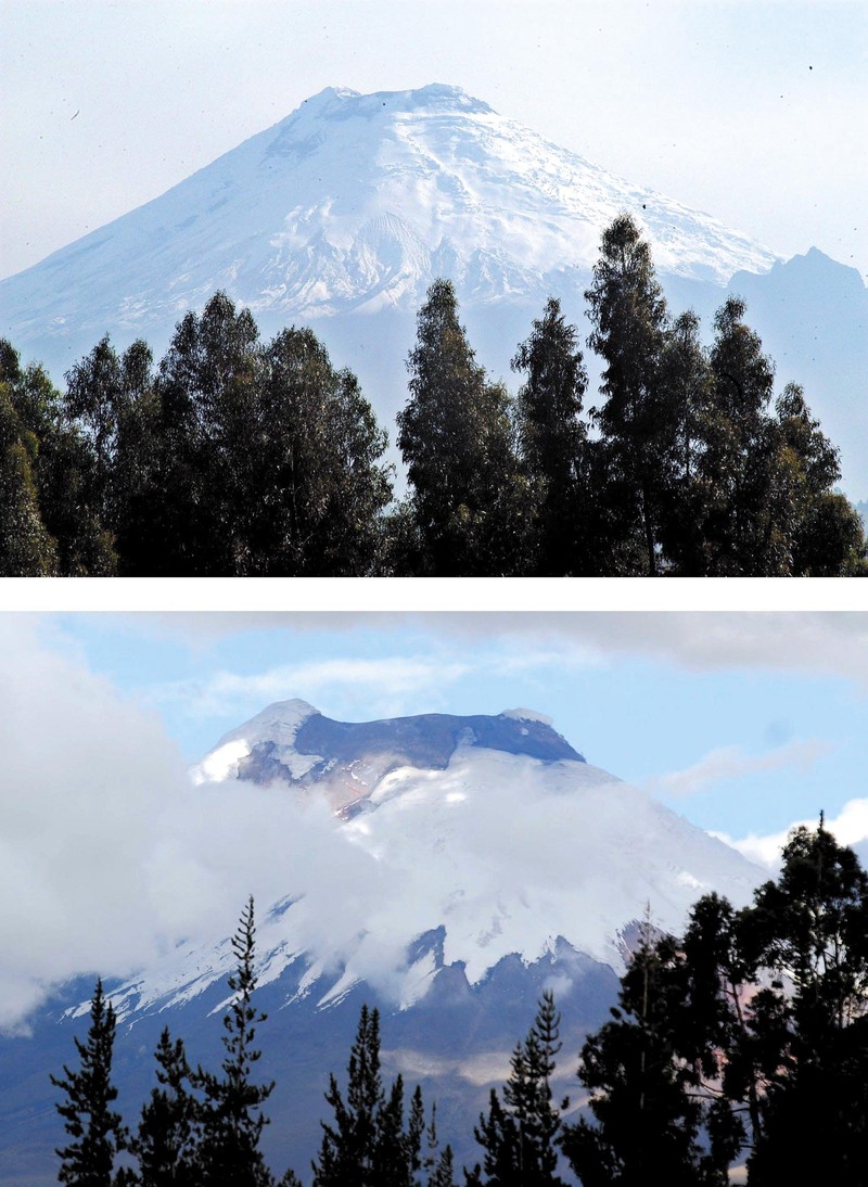 厄瓜多尔科多帕希火山合成图,上图为2006年3月14日拍摄,下图为2007年1月14日拍摄。位于云南丽江以北25公里处的玉龙雪山是我国纬度最南的一座雪山,同时也是欧亚大陆雪山中距离赤道最近的海洋型冰川区,近年其冰川不断退缩,有研究证明,气候变暖是玉龙雪山冰川退缩的主要原因。乞力马扎罗山的峰顶一直为皑皑白雪所覆盖,目前其峰顶的冰河与积雪正在融化。专家把这一现象归咎于全球气候变暖,并指出亚洲的喜马拉雅山也面临着类似的问题。 )
