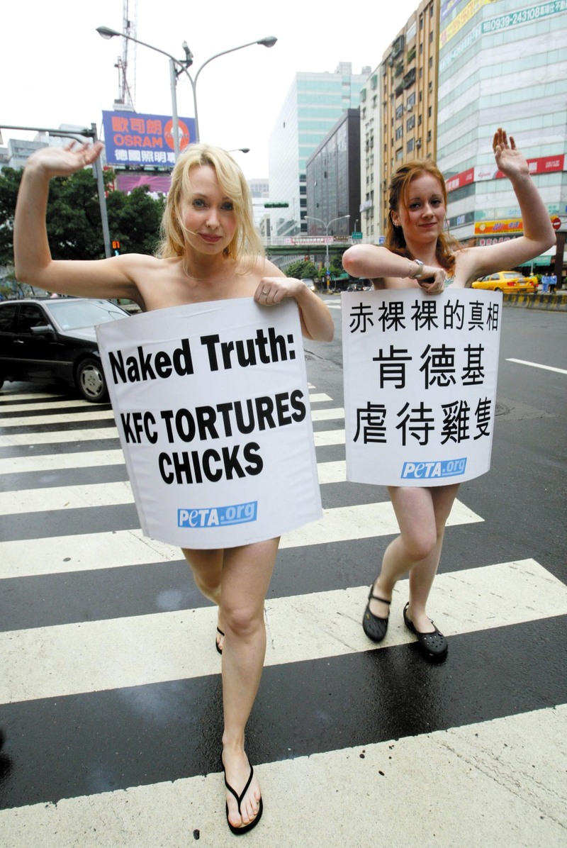 2007年1月19日,两位善待动物组织亚太分部的成员泰勒(Yvonne Taylor)(右)与弗鲁诺(Ashley Fruno)(左),裸身前往台北基隆路与光复南路口的肯德基,抗议肯德基鸡供货商在工厂式养殖场及屠宰场的虐待鸡行为。 )