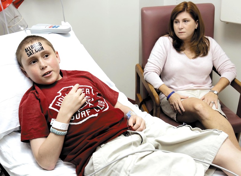 身患白血病的11岁男孩帕特里克(Patrick Pedraja)在电子港湾网站上拍卖出了他脑门上的广告位,收入将被用于组织骨髓捐献者驾车穿越美国。这项活动计划于今年5月开始,目的是在全美征集更多的骨髓捐献者。帕特里克的心愿是在今年给国家骨髓库增加2007名捐赠者。17日,在美国佛罗里达州圣约瑟芬儿童医院,正在化疗的帕特里克接受采访。 )