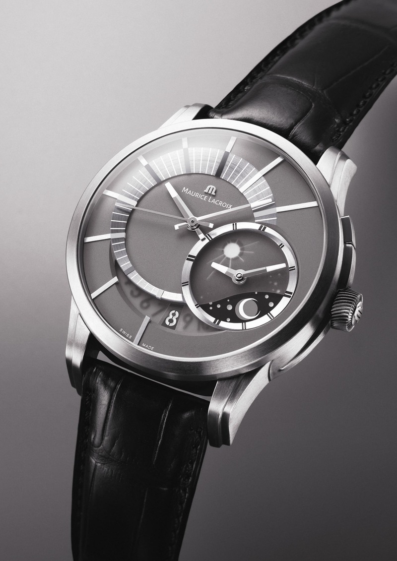 对于那些经常跨大洲出差的空中飞人,计算时差永远是很麻烦的事情。Maurice Lacroix的奔涛偏心腕表试图通过两套计时系统满足简化这种时差问题,本地时间占据了三分之二的表盘,异地时间则屈居在右下角,在标示白天黑夜的转盘上还设计以小太阳和月亮来提示。腕表直径45毫米,全机使用钛金属材料,表带则搭配鳄鱼皮缝制。 )