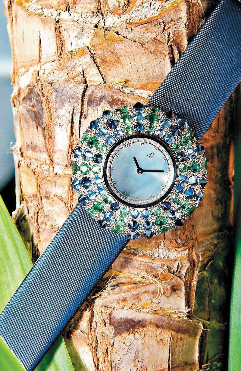 Bertolucci虽然是瑞士手表品牌,它的创始人贝托鲁奇却出生于意大利,手表的风格也是意大利式的铺陈和浪漫。它新推出的Uoni腕表用了外圈镶上多款宝石的设计,在白金表壳上镶有36颗钻石、89颗蓝宝石及绿色宝石,再配上珍珠贝母表盘和蓝色的缎面表带。Bertolucci用的是瑞士的外厂机芯,近年来它的手表的种类始终集中在女款珠宝表上。 )