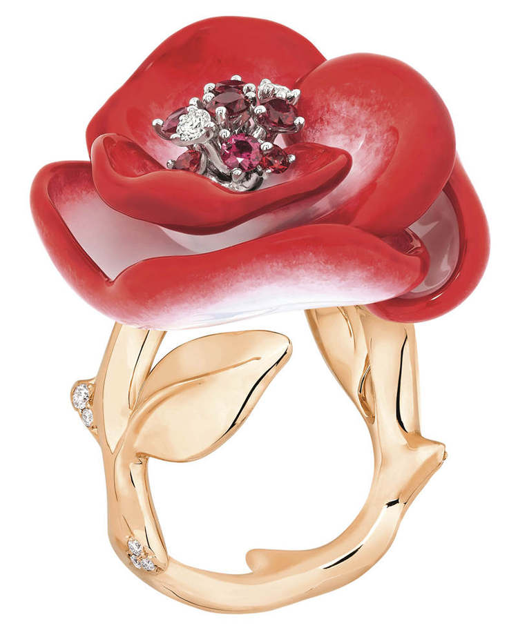 迪奥Rose Dior Pop系列金质玫瑰戒指以红色亮面漆绘打造玫瑰花瓣,珍贵宝石化身玫瑰花蕊,花茎的繁复设计则呼应诗意变化的经典玫瑰枝造型。